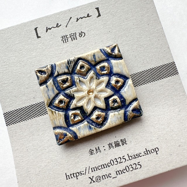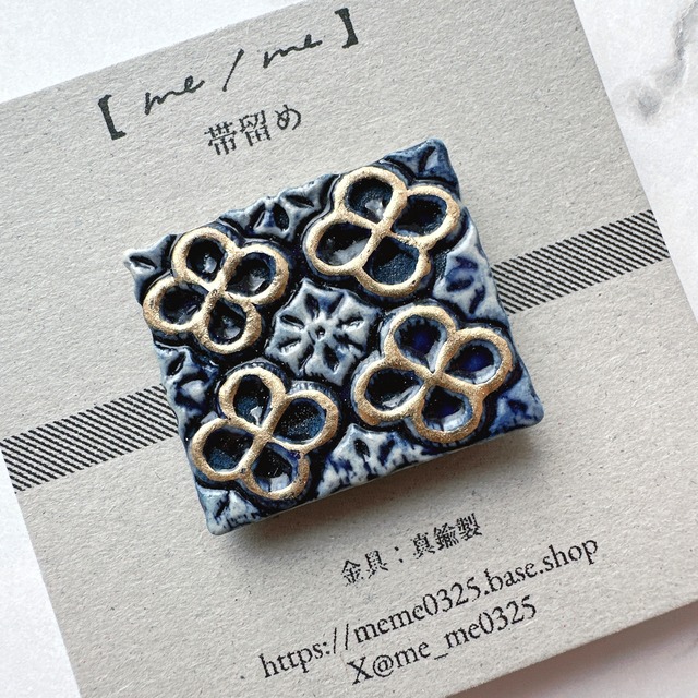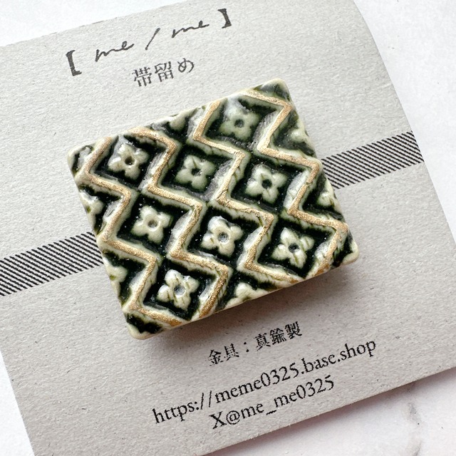 陶製の装飾モチーフの帯留。 品がありながら華やかな印象で、小ぶりでも存在感があります。釉薬の色合いが高級感を醸し出します。 【素材】陶 【金具】真鍮 ※接着済みのため金具の変更は出来ません。