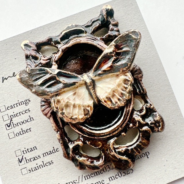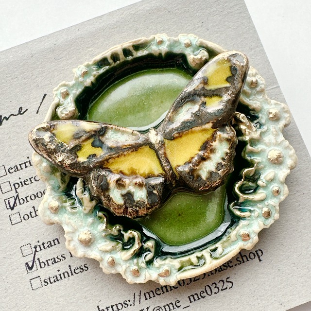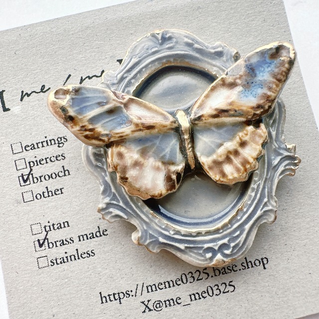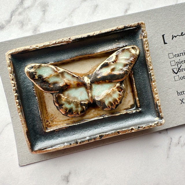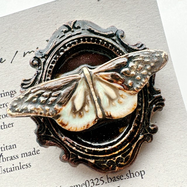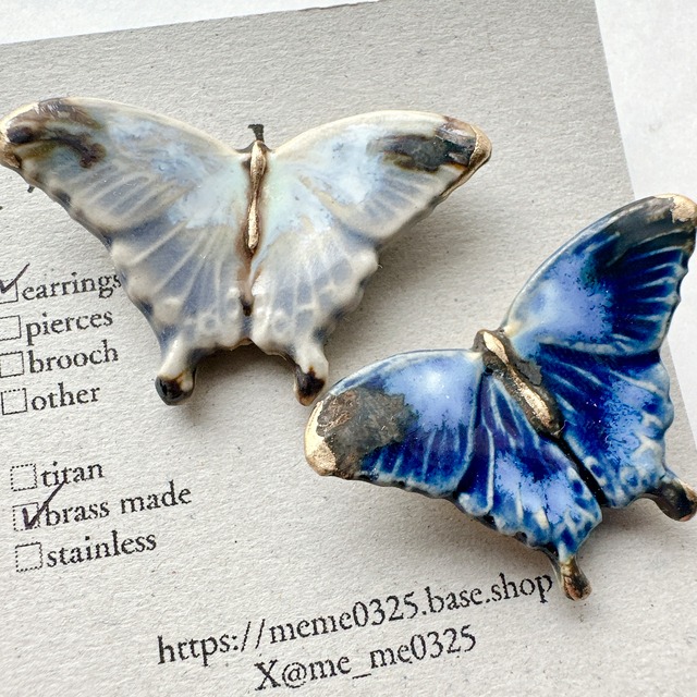 陶製の蝶モチーフイヤリング。 上品な釉色で上品かつ華やかな印象です。存在感があり和服やパーティーシーンにもおすすめです。 【素材】陶 【金具】真鍮 ※接着済みのため金具の変更は出来ません。