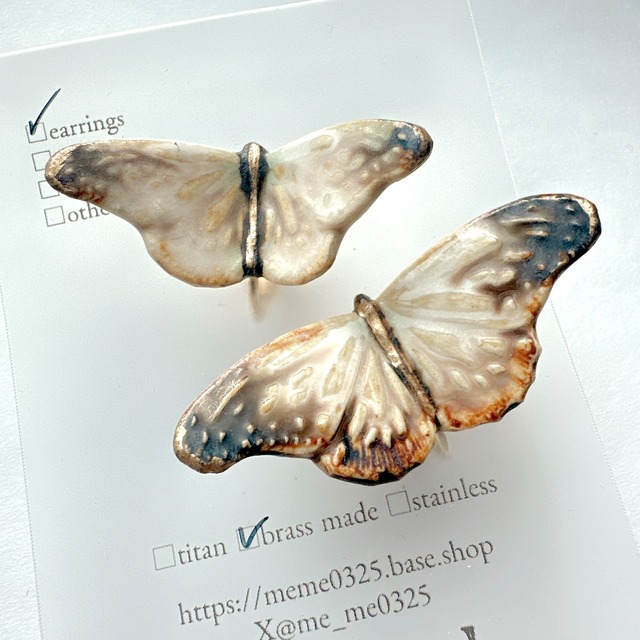 陶製の蝶モチーフイヤリング。 上品な釉色で上品かつ華やかな印象です。存在感があり和服やパーティーシーンにもおすすめです。 【素材】陶 【金具】真鍮 ※接着済みのため金具の変更は出来ません。
