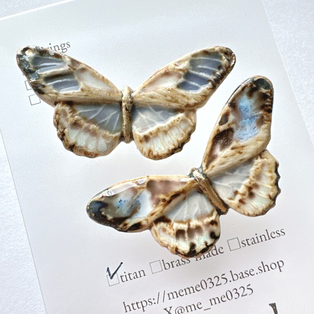 陶製の蝶モチーフピアス。 上品な釉色で上品かつ華やかな印象です。存在感があり和服やパーティーシーンにもおすすめです。 【素材】陶 【金具】チタン ※接着済みのため金具の変更は出来ません。